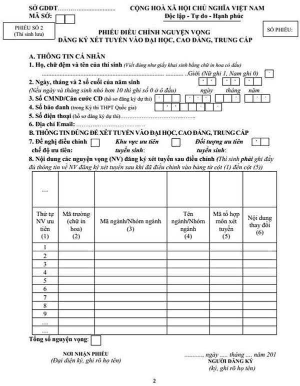Mẫu phiếu điều chỉnh nguyện vọng số 2 các năm trước