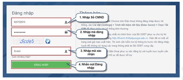 Thí sinh đăng nhập bằng tài khoản đã được cấp