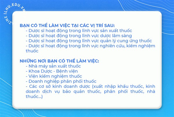 Có phải bạn đã từng nghĩ rằng học xong ngành dược sẽ làm việc tại các nhà thuốc? Thật ra, sau khi tốt nghiệp với chuyên môn Dược sĩ đại học có rất nhiều lĩnh vực hoạt động nghề nghiệp bởi vì ngành dược luôn khan hiếm nhân lực.