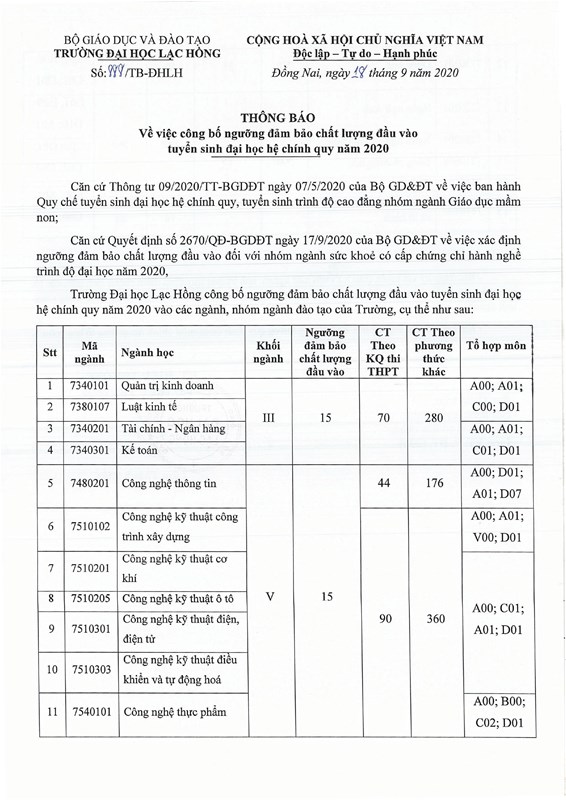 Trường Đại học Lạc Hồng công bố ngưỡng đảm bảo chất lượng đầu vào tuyển sinh đại học hệ chính quy năm 2020