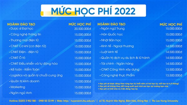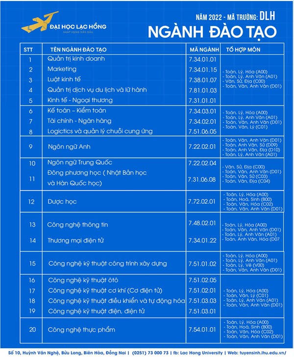 Năm 2022, Trường Đại học Lạc Hồng thông báo tuyển sinh 20 ngành hệ đại học chính quy: