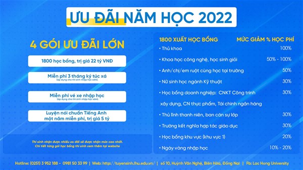 => Còn chần chừ gì không đăng ký xét tuyển đại học TẠI ĐÂY để nhận ngay những ưu đãi cực kỳ hấp dẫn tại Đại học Lạc Hồng.