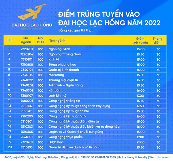 Trường Đại học Lạc Hồng thông báo xét tuyển bổ sung cho 20 ngành đào tạo hệ đại học chính quy, năm 2022 cho phương thức xét tuyển dựa vào Kết quả thi THPT và phương thức xét tuyển học bạ, phương thức xét tuyển bằng kỳ thi đánh giá năng lực.