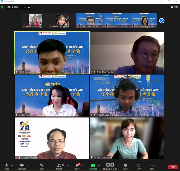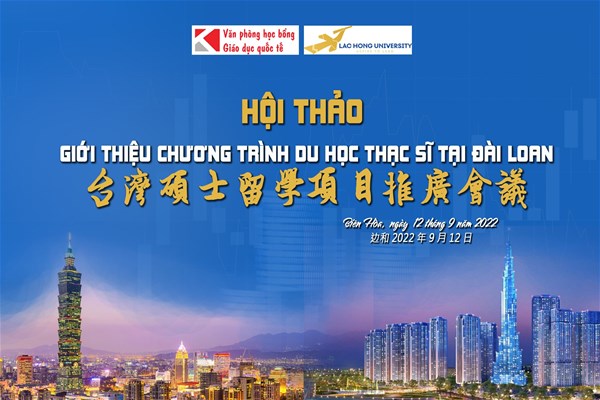 Ngày 12 tháng 9 năm 2022, Phòng Quan hệ Quốc Tế Trường Đại học Lạc Hồng đã tổ chức buổi hội thảo trực tuyến giữa Trường Đại học Lạc Hồng và Văn phòng học bổng giáo dục quốc tế nhằm để thảo luận các thông tin về chương trình du học theo hệ chuyển tiếp, thực tập có lương, thạc sĩ tài năng và thạc sĩ thưc tập tại các Trường Đại học danh tiếng của Đài Loan.