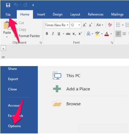 Bước 1: Bạn nhấn vào tùy chọn  File  trên thanh công cụ của Word --> Chọn  Options .
