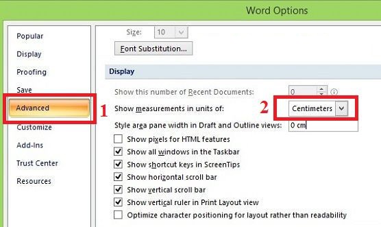Bước 2: Các bạn chọn tab  Advanced  trong menu bên phải, sau đó nhìn sau bên phải, trong phần  Display  chọn đơn vị  trong mục  Show measurements in units of centimeters  là Millimeters . Sau đó nhấn  OK  để lưu lại thay đổi.