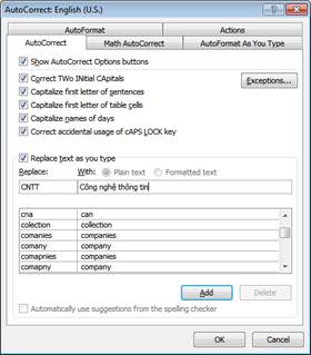 Trong hộp thoại trên, từ sai được liệt kê ở bên cột trái tương ứng với từ đúng ở bên cột phải. Như vậy chỉ khi nào gõ đúng từ sai ở bên trái thì Ms Word sẽ tự động thay thế từ đúng ở bên phải.