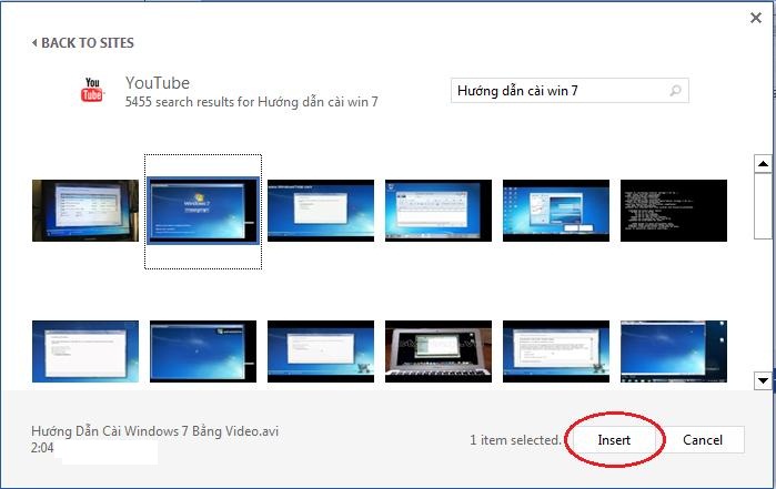 Danh sách các video theo từ khóa cần tìm sẽ xuất hiện. Chọn video cần chèn rồi ấn “Insert”.