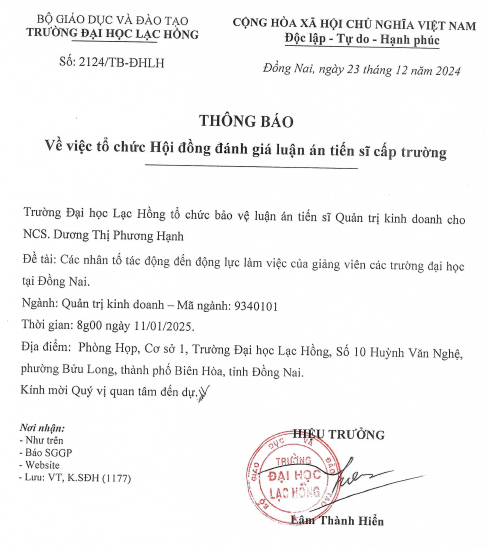 Thông báo lịch bảo vệ luận án tiến sĩ cấp Trường ngành Quản trị kinh doanh tháng 01 năm 2025