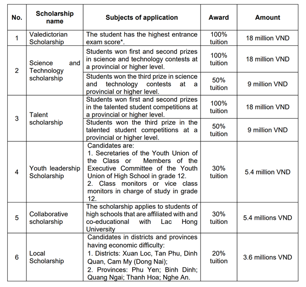 Particularly, scholarships for students of high schools cooperating with Lac Hong University only be maintained if the student has the next semester's academic result of Excellent or higher and fully satisfies the above conditions.