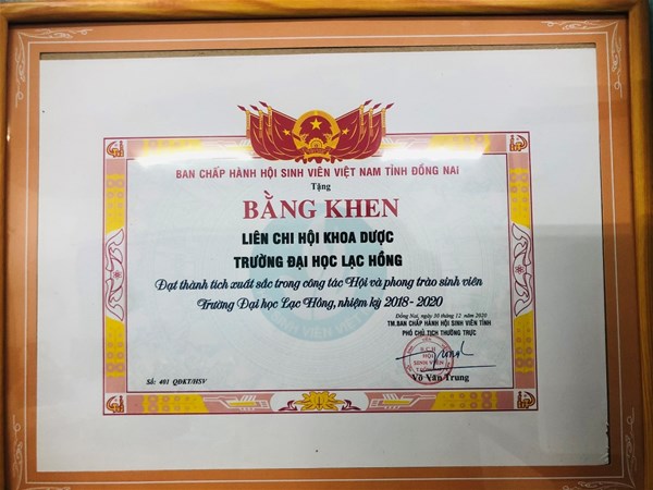 Wednesday  30th December, 2020. The 8th Congress of Vietnamese Students’ Association of The University of Lac Hong university, the term 2020 - 2023, took place in a very solemn atmosphere. Mark the transformation of Vietnamese Students’ Association of The University of Lac Hong university from the 7th Congress to the 8th Congress. In order to elect the typical comrades nominated from faculties to join the system of Vietnamese Students’ Association of The University of Lac Hong university, commend The Associated Organ of Vietnamese Students’ Association of faculties and the comrades completed excellently at work. In that congress, The Associated Organ of Vietnamese Students’ Association of Pharmacy Faculty was awarded a certificate of merit by Vietnamese Students’ Association of Dong Nai province for outstanding achievements in Vietnamese Students’ Association of The University of Lac Hong university work and the student movement of Lac Hong University, the term 2018-2020. Beside, The Associated Organ of Vietnamese Students’ Association of Pharmacy Faculty won 3 individual titles from comrades: