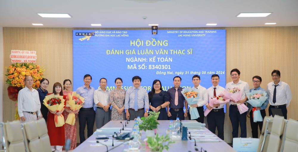 The thesis defense council consisted of leading experts in the field of Accounting, providing in-depth and valuable evaluations. Members of the council included: Dr. Lu Phi Nga – Dean of the Graduate School, Lac Hong University; Dr. Nguyen Quoc Huy and Dr. Nguyen Van Hai – both from Lac Hong University; Assoc. Prof. Dr. Huynh Duc Long – from the School of Business, University of Economics Ho Chi Minh City; Assoc. Prof. Dr. Phan Duc Dung – from University of Economics and Law, Vietnam National University Ho Chi Minh City; and Dr. Nguyen Van Dung – from Eastern Technology University. The participation of these experts not only ensured objectivity but also fostered an environment of in-depth academic discussion and critique, helping the students further refine their research.