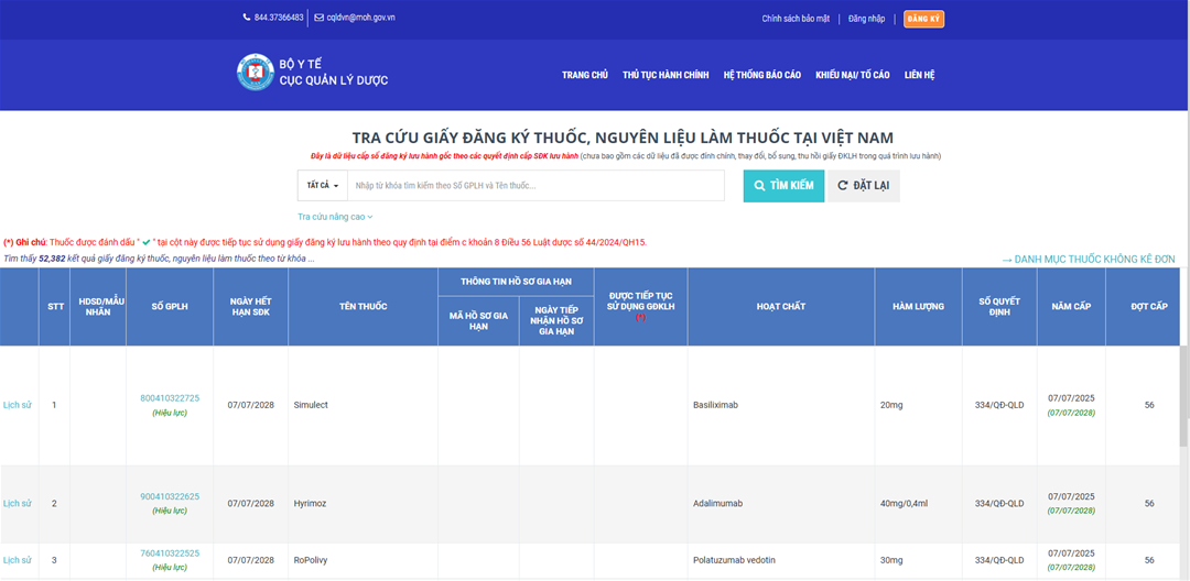 Website interface for drug registration information lookup, Ministry of Health